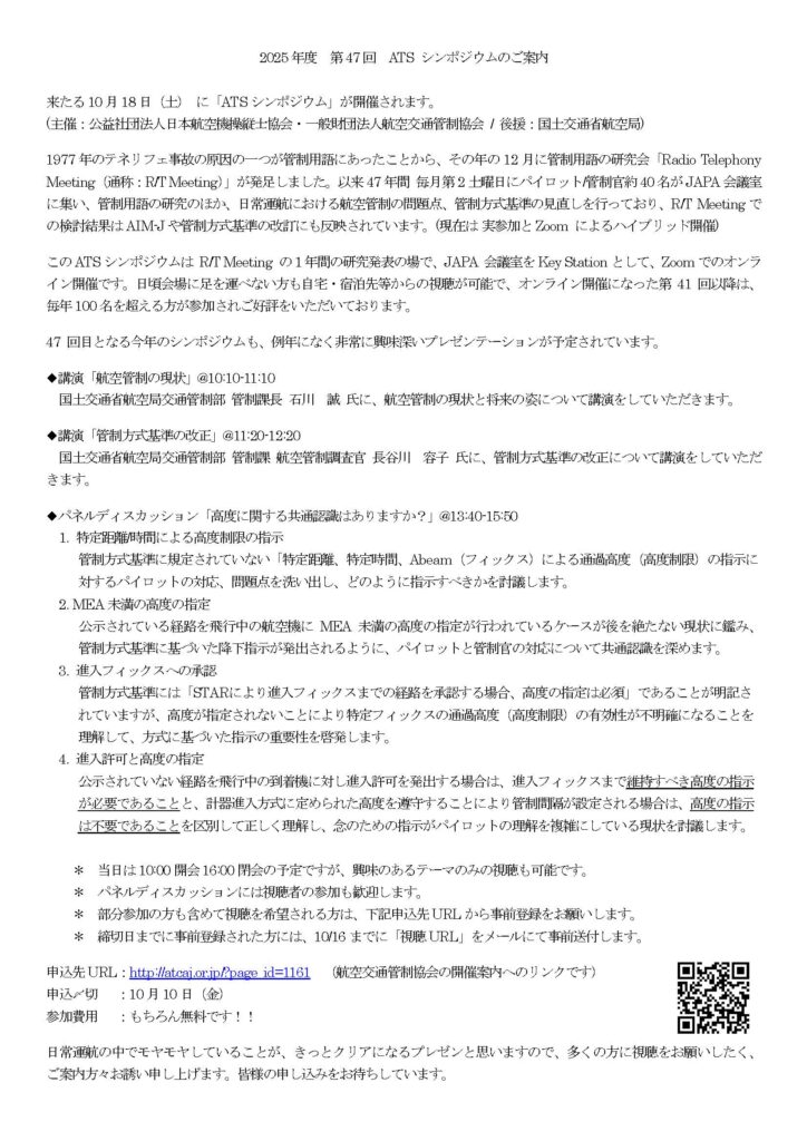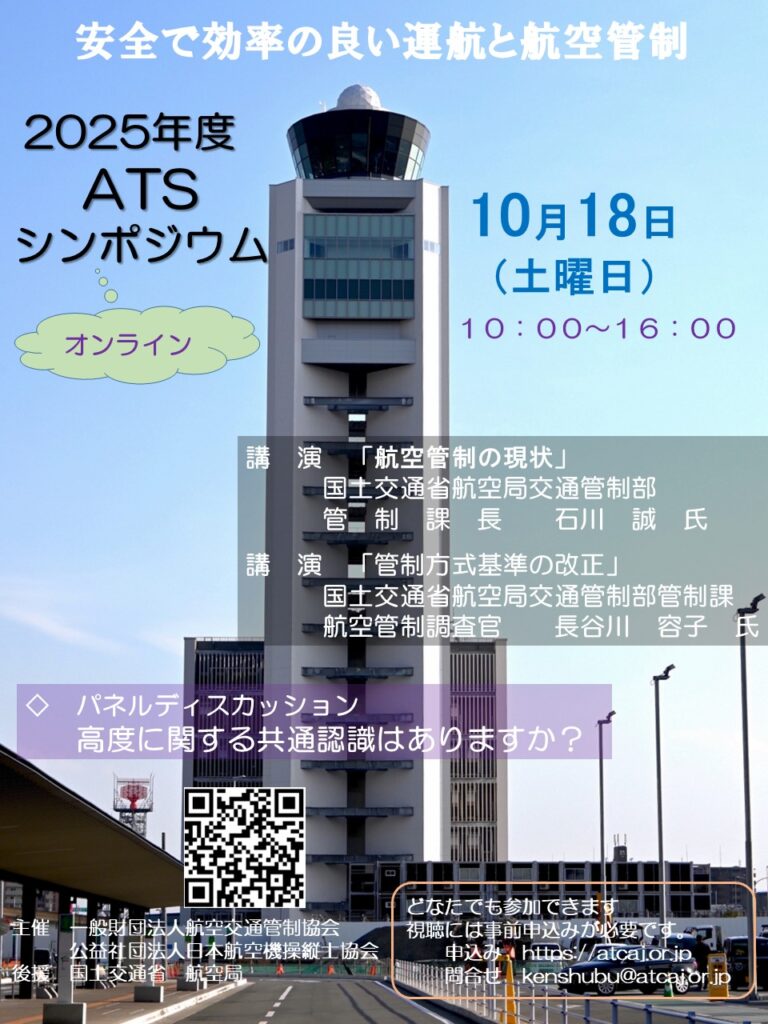 一般財団法人航空交通管制協会と公益社団法人日本航空機操縦士協会は、10月18日(土)に2025年度第47回ATSシンポジウムを開催します。